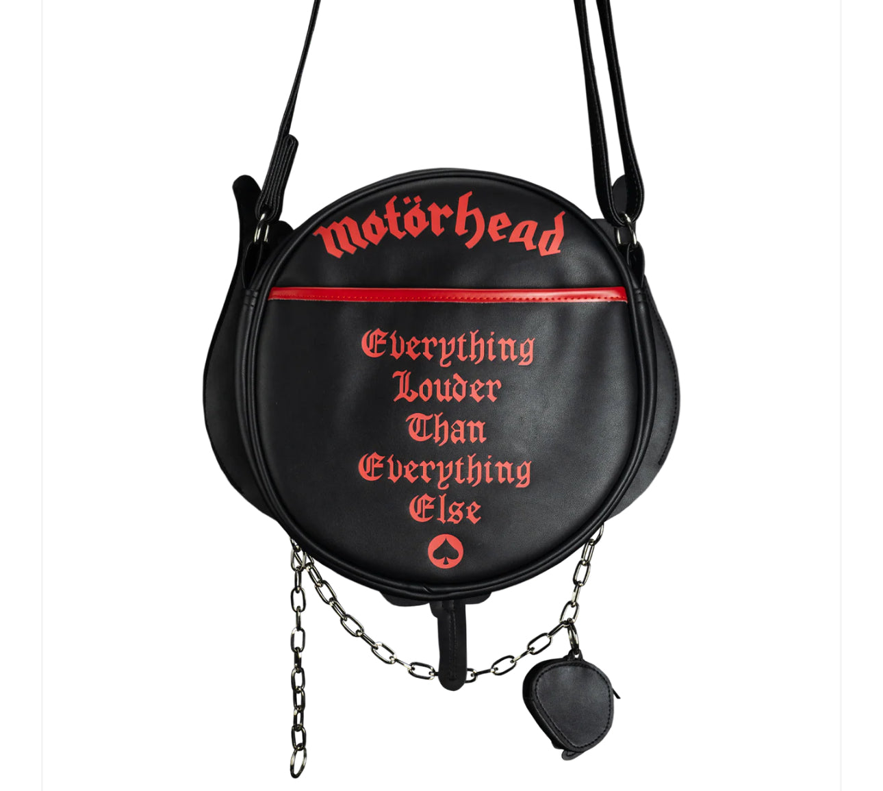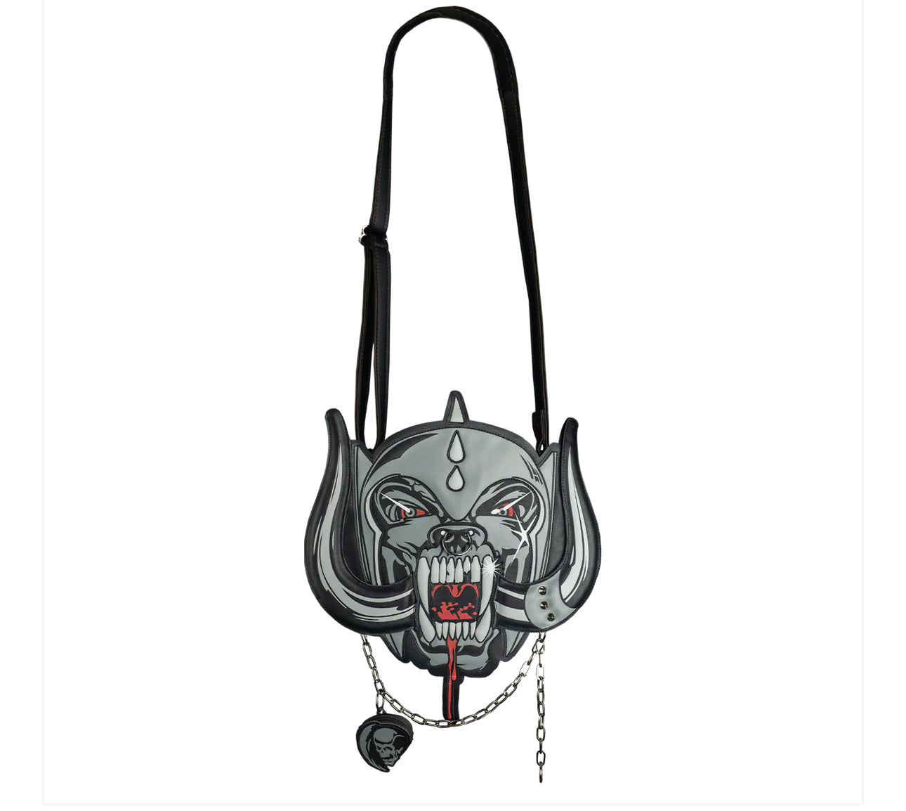 This incredible purse is based on the iconic Motörhead Warpig. Made using the highest quality vegan leather for excellent durability, the bag has a printed inner lining with a large center pocket, two side pockets, an adjustable strap, a detachable skull coin purse, metal chains and custom zipper pull.