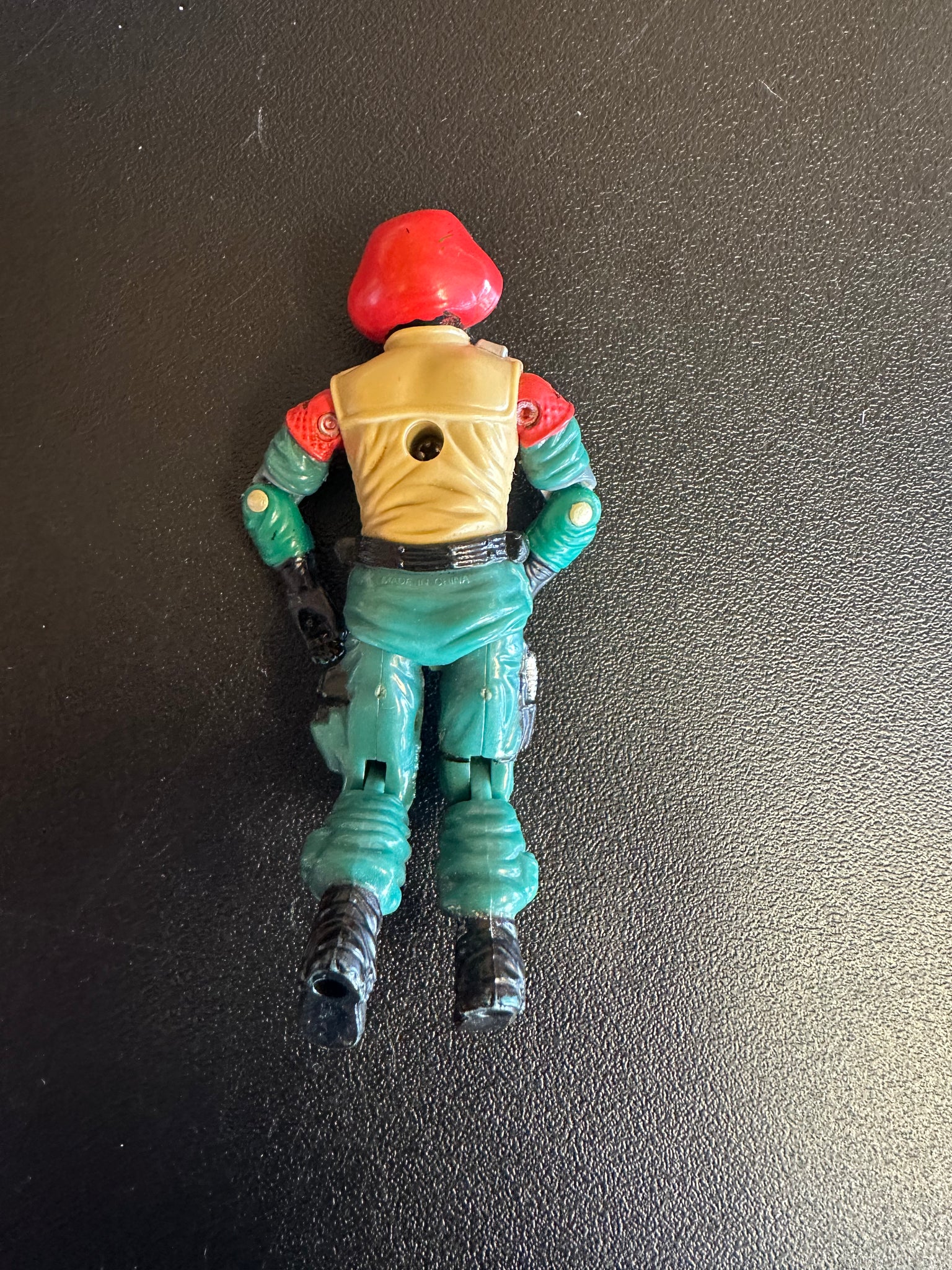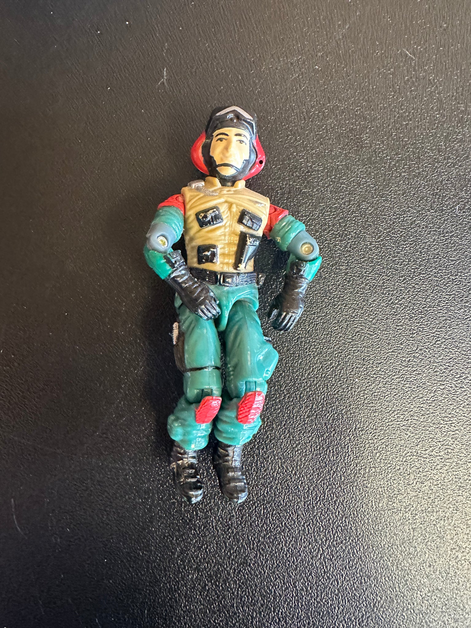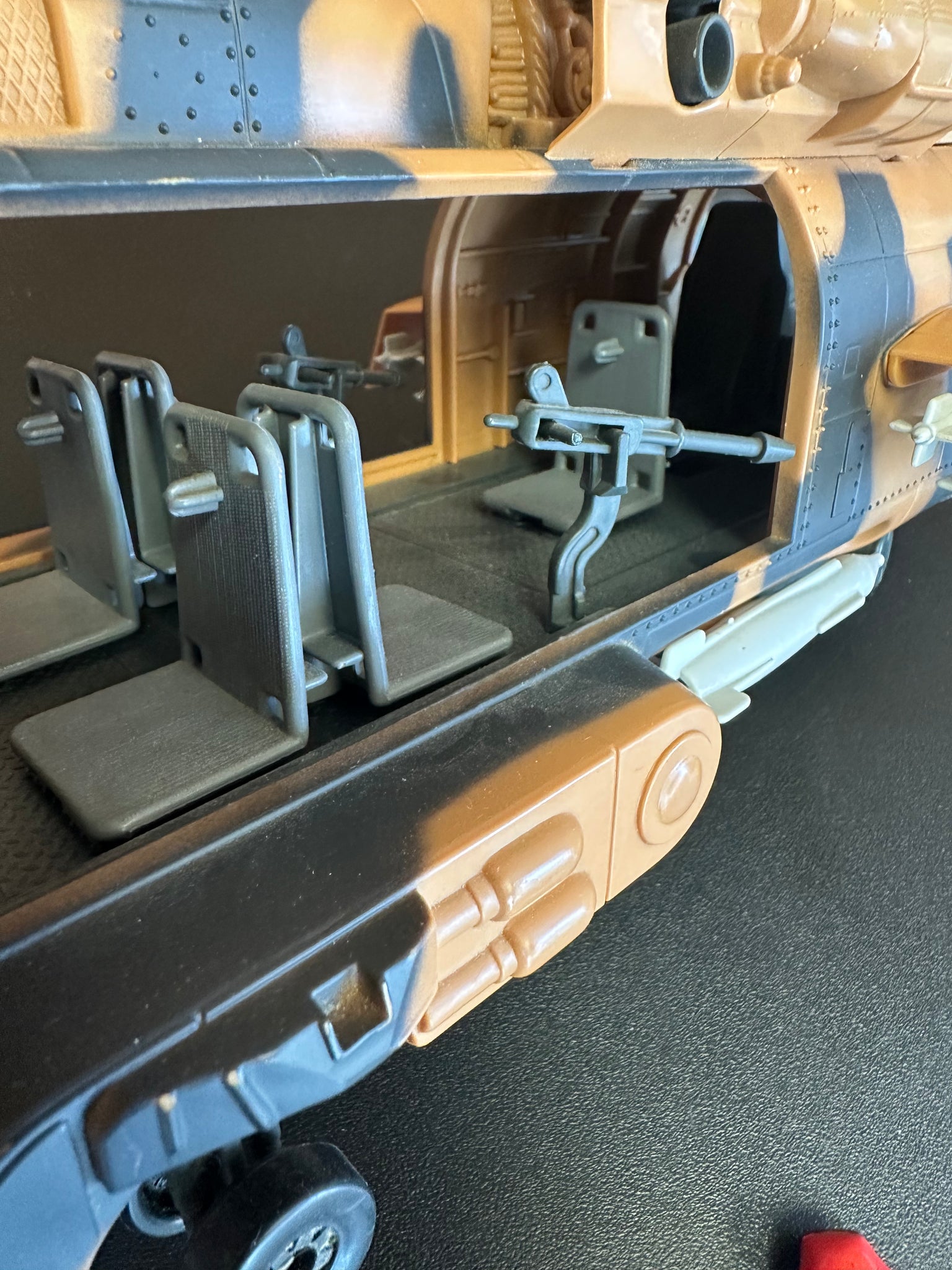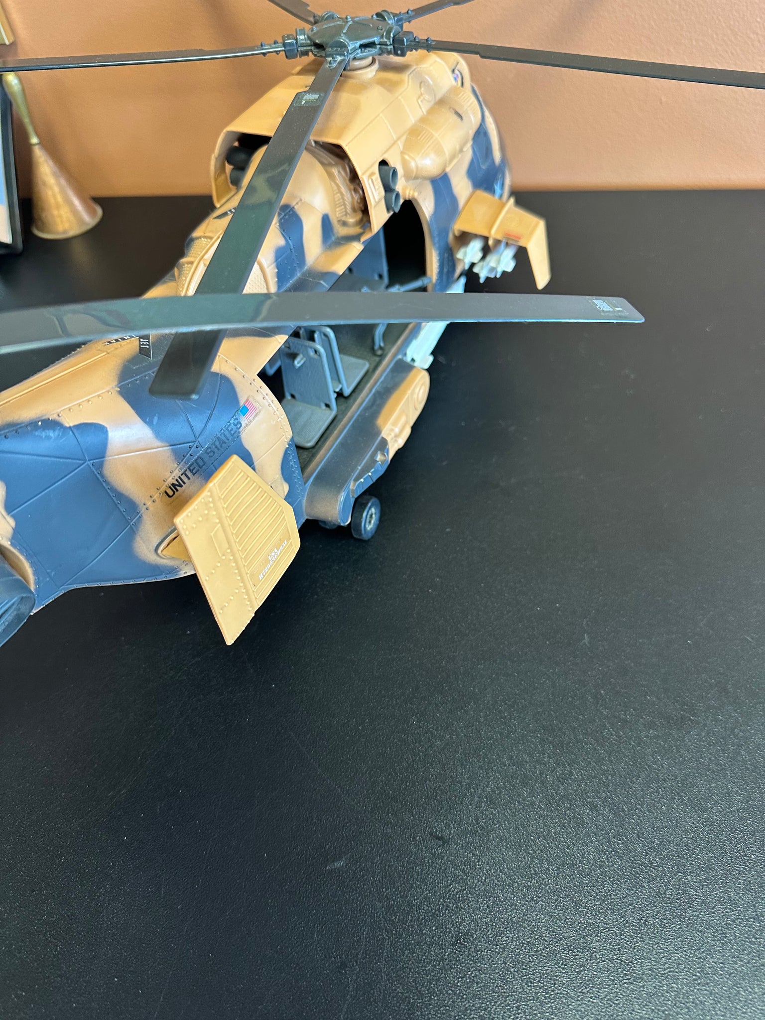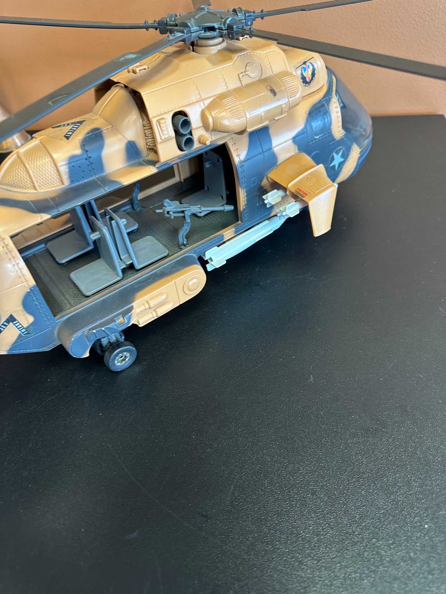 Preowned played with condition. Helicopter is complete but copter blades are saging down on back, front window is missing clip, has wear from play. See pictures for condition. Pilot- has wear, No mic. Approximately 22” long.