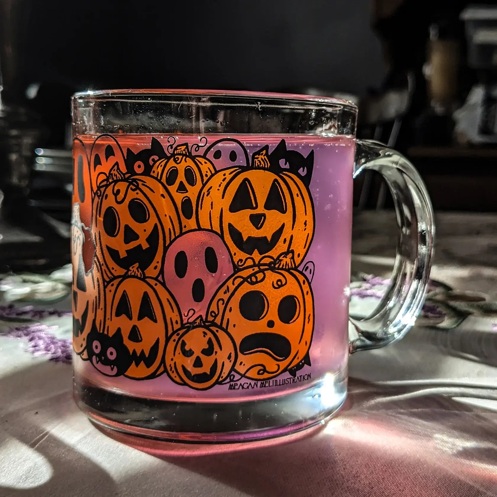 This mug has it all: 13oz capacity, no lead content, eco-friendly inks, a wrap-around image that is dishwasher AND microwave safe, all in a lightweight glass package! Modernize your vintage mug collection without compromising on your spooky style! Each mug comes with a care card to be kept inside the mug for your customers :)
